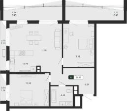 Продаётся 3-комнатная квартира в строящемся доме (дом 2), срок сдачи: III-кв. 2027, общей площадью 69.61 кв.м., на 2 этаже.