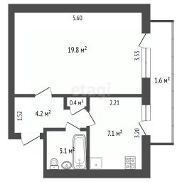 В квартире прихожая - 4,2м2, кухня 7,1 м2., жилая комната - 19,8м2. санузел/ванна совмещены - площадь 3,1 м2. В квартире проведена замена электропроводки, системы водоснабжения, установлены счетчики. Установлен проточный газовый водонагреватель. Просторный балкон имеет два входа с кухни и жилой комнаты.