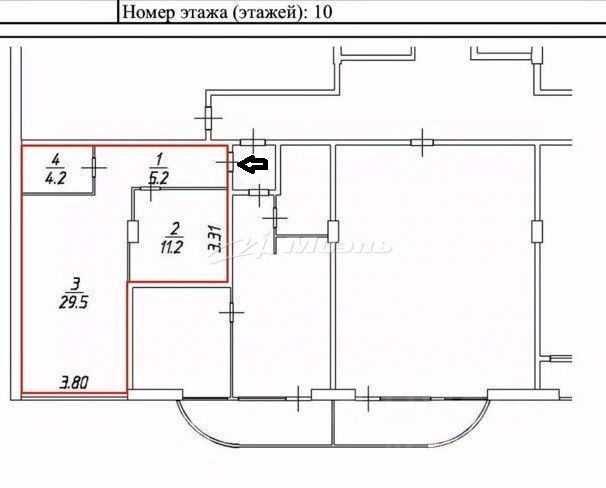 Площадь: общая 50.1 кв.м., жилая 29,5 кв.м., кухня 11.2 кв.м., холл 5,2 кв.м., санузел 4,2 кв.м.