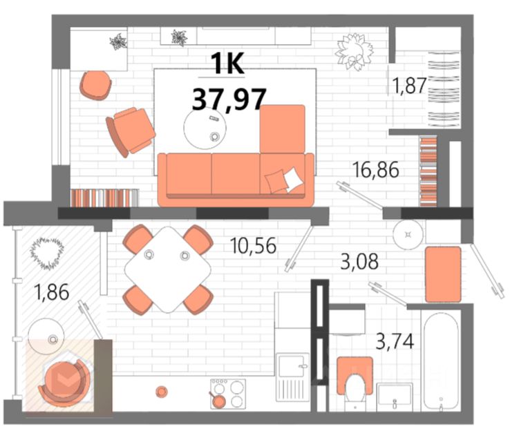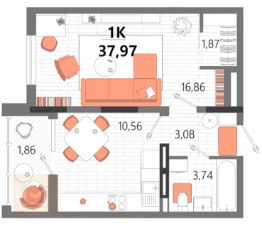 • Планировка: Изолированная комната 16,86 м² + просторная кухня 10,56 м²