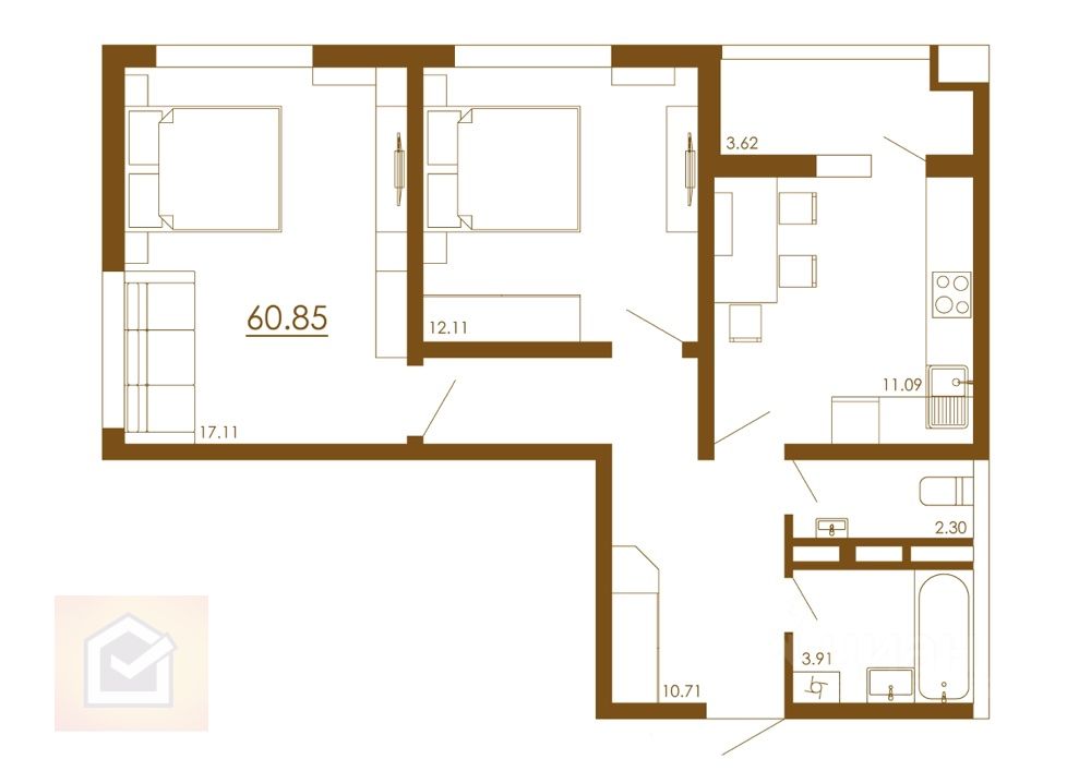 Продается 2-ком. квартира 60.85м² в современном жилом комплексе.