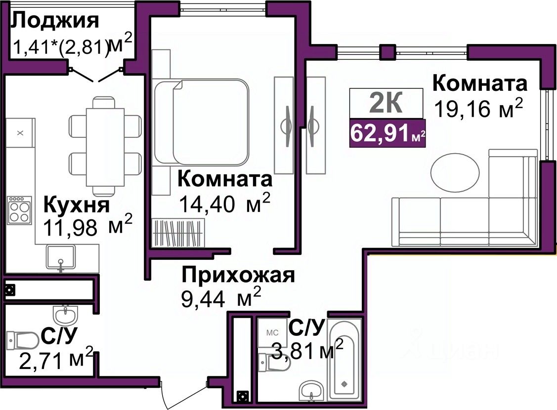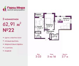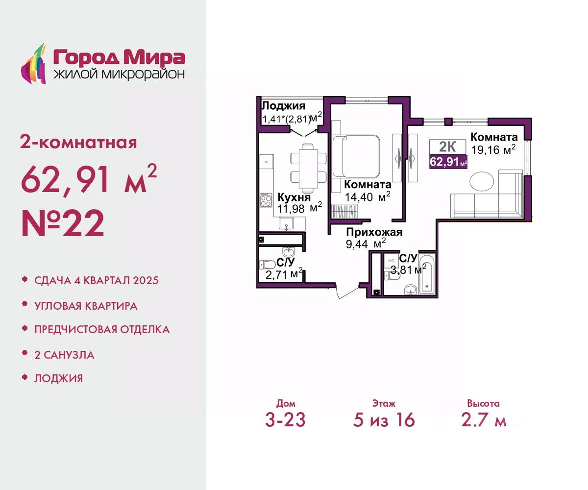 Двухкомнатная квартира с предчистовой отделкой в ЖМ "Город Мира" на 5 этаже. Общая площадь: 62.91 кв.м., жилая: 33.56 кв.м., площадь просторной кухни-столовой: 11.98 кв.м. Угловая квартира, окна oбecпeчивaют paвнoмepнoe ocвeщeниe в тeчeниe дня. В квартире одна лоджия, один совмещенный и один раздельный санузел. Высота потолков 2.7 м.