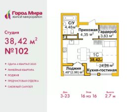 Успейте забронировать по этой цене! Срок акции ограничен! Стоимость квартиры указана со скидкой, ваша экономия составит 729,950 RUB. Звоните, наши менеджеры вам все расскажут! 1-комн. квартира-студия с предчистовой отделкой в ЖМ "Город Мира" на 16 этаже. Общая площадь: 38.42 кв.м., площадь гостиной 24.28 кв.м., из которых 5 кв.м. выделено под кухонную зону. Все окна выходят на одну сторону. В квартире одна лоджия, один совмещенный санузел. Высота потолков 2.7 м. "Город Мира" это масштабный жилой комплекс, созданный для тех, кто ценит комфорт, безопасность и гармонию с природой. Здесь продумана каждая деталь от удобной инфраструктуры до эргономичных планировок квартир. Главные преимущества: Удачное расположение зеленый район с благоприятным микроклиматом Продуманное зонирование жилые кварталы, зоны отдыха и коммерческие объекты Комфорт-класс высокое качество строительства и современные инженерные решения Инфраструктура Города Мира: Образование и досуг: 2 детских сада (по 260 мест каждый) Планируется строительство общеобразовательной школы Детские и спортивные площадки в каждом дворе Беседки для отдыха, зоны для выгула собак Торговля и сервис: Магазины, аптеки, медицинские центры Фитнес-клубы, салоны красоты Детские развивающие центры Парковки: Гостевые парковки Наземные и подземные паркинги Благоустройство территории: Ландшафтный дизайн с зонами отдыха Современные детские площадки Стильные холлы с дизайнерской отделкой Система видеонаблюдения для безопасности. Почему именно 23-й дом? Комфорт и планировки: • Просторные квартиры с двумя санузлами и гардеробными • Увеличенная площадь остекления — максимум света и воздуха • Индивидуальное отопление — комфорт в любое время года Эстетика и стиль: • Дизайнерские входные группы — стиль начинается с порога • Архитектурная подсветка фасада — дом, которым хочется гордиться • Панорамные виды на город и сосновый бор рядом Инфраструктура и удобство: • Консьерж-сервис — дополнительный уровень сервиса и безопасности • Колясочные • Выполнена стяжка пола и штукатурка стен • Центральная локация внутри микрорайона — тишина и доступность Жизнь внутри дома: • Двухэтажный стилобат с коммерцией: магазины, кафе, офисы, студии и даже школа танцев • Современный двор: детский игровой комплекс, зоны отдыха для взрослых, зарядка для электромобилей, зона wi-fi на улице Возможно приобретение в ипотеку по выгодным условиям: • ставка — от 6% годовых • первоначальный взнос — от 20% • срок — до 30 лет • можно использовать материнский капитал даже на первый взнос. Также доступны военная и IT-ипотека Рассрочка от застройщика: • первый взнос от 30%, • равномерные платежи до окончания строительства. Квартира находится в корпусе 3_23. Дом монолитный, одноподъездный, высотой 16 этажей. В подъезде 1 пассажирский и 1 грузовой лифт. Окончание строительства - 4 квартал 2025 года. Оформление сделки по договору долевого участия. #2m64ZU