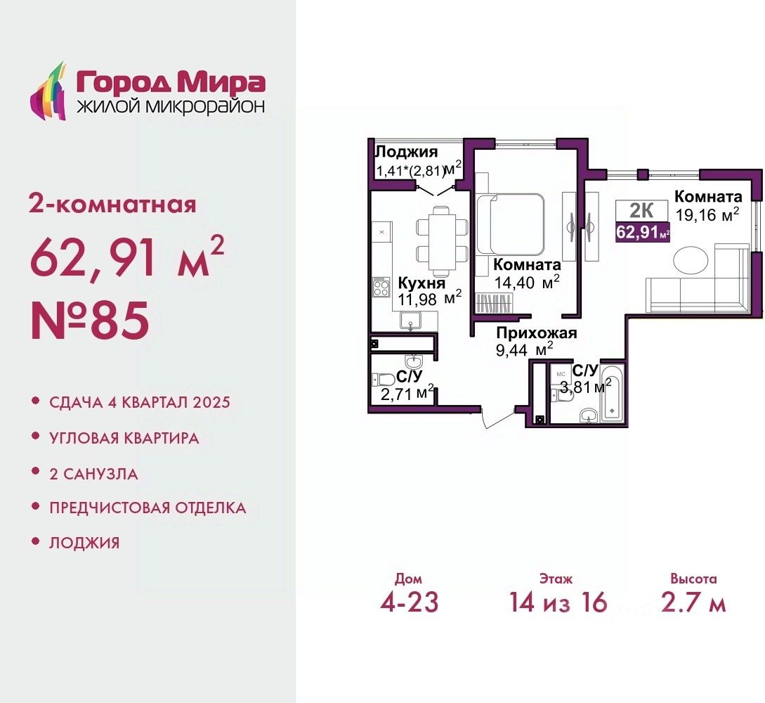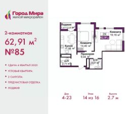 Двухкомнатная квартира с предчистовой отделкой в ЖМ "Город Мира" на 5 этаже. Общая площадь: 62.91 кв.м., жилая: 33.56 кв.м., площадь просторной кухни-столовой: 11.98 кв.м. Квартира угловая, очень светлая, естественная вентиляция при открытии окон. В квартире одна лоджия, один совмещенный и один раздельный санузел. Высота потолков 2.7 м.