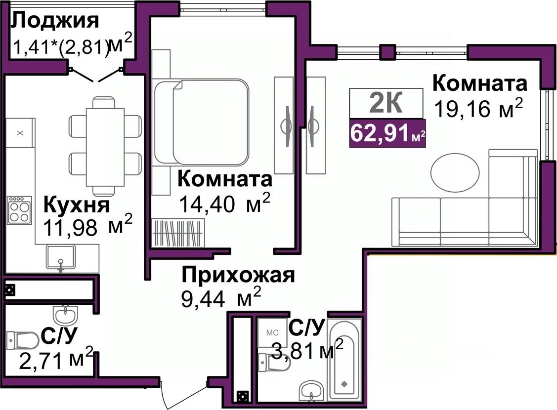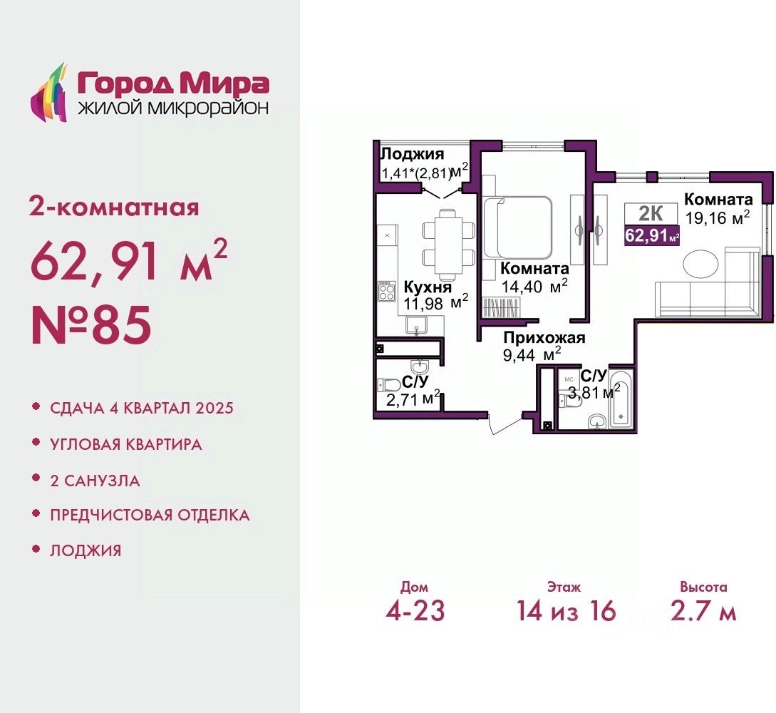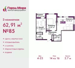 Двухкомнатная квартира с предчистовой отделкой в ЖМ "Город Мира" на 6 этаже. Общая площадь: 62.91 кв.м., жилая: 33.56 кв.м., площадь просторной кухни-столовой: 11.98 кв.м. Квартира угловая, идеально подойдет любителям тишины и панорамных видов. В квартире одна лоджия, один совмещенный и один раздельный санузел. Высота потолков 2.7 м.