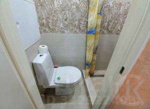 Диван, кресло, журнальный столик, шкаф для одежды, кухня, стиральная машина, холодильник, микроволновка. Санузел совмещен с душем и выложен кафелем.