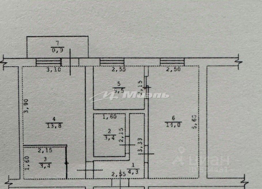 Общая площадь 44.4 кв. м., кухня 5,5 кв. м.