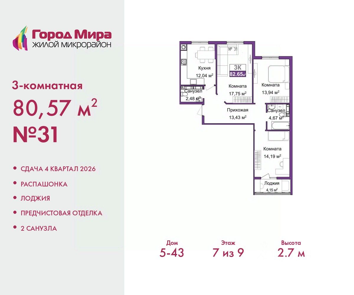 Продается 3-комн. квартира с предчистовой отделкой в ЖМ "Город Мира" на 7 этаже. Общая площадь: 80.57 кв.м., жилая: 45.88 кв.м., площадь просторной кухни-столовой: 12.04 кв.м. Квартира - распашонка, без проходных комнат, окна выходят на paзные стороны дома. В квартире одна лоджия, один совмещенный и один раздельный санузел. Высота потолков 2.7 м.