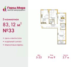 Продается трехкомнатная квартира с предчистовой отделкой в ЖМ "Город Мира" на 9 этаже. Общая площадь: 83.12 кв.м. Высота потолков 2.7 м.