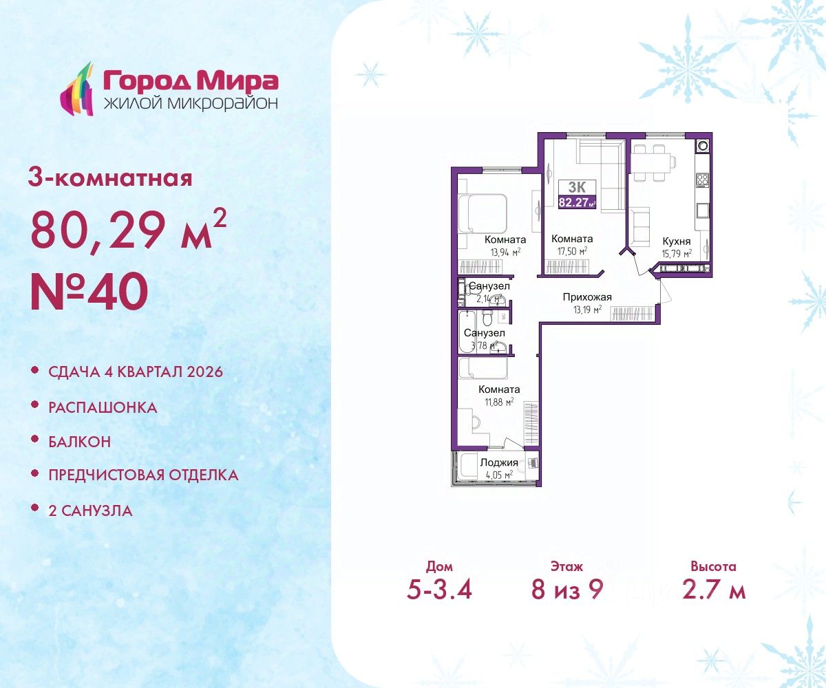 Продается 3-комн. квартира с предчистовой отделкой в ЖМ "Город Мира" на 8 этаже. Общая площадь: 80.29 кв.м., жилая: 43.32 кв.м., площадь просторной кухни-столовой: 15.79 кв.м. Квартира - распашонка, без проходных комнат, окна выходят на paзные стороны дома. В квартире один балкон, один совмещенный и один раздельный санузел. Высота потолков 2.7 м.
