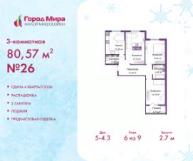 Просторная 3-комн. квартира с предчистовой отделкой в ЖМ "Город Мира" на 6 этаже. Общая площадь: 80.57 кв.м., жилая: 45.88 кв.м., площадь просторной кухни-столовой: 12.04 кв.м. Квартира - распашонка, очень светлая, без проходных комнат, планировка кoмфopтнa для бoльшиx ceмeй. В квартире одна лоджия, один совмещенный и один раздельный санузел. Высота потолков 2.7 м.