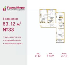 3-комн. квартира от застройщика с предчистовой отделкой в ЖМ "Город Мира" на 9 этаже. Общая площадь: 83.12 кв.м. Высота потолков 2.7 м.