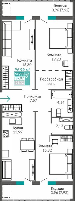 Продаётся 3-комнатная квартира в строящемся доме (С7), срок сдачи: III-кв. 2027, общей площадью 89.07 кв.м., на 7 этаже. Жилой квартал "Абрикос" - начало яркой истории жизни в прогрессивном районе Симферополя - Семья городских кварталов "Крымская Роза".