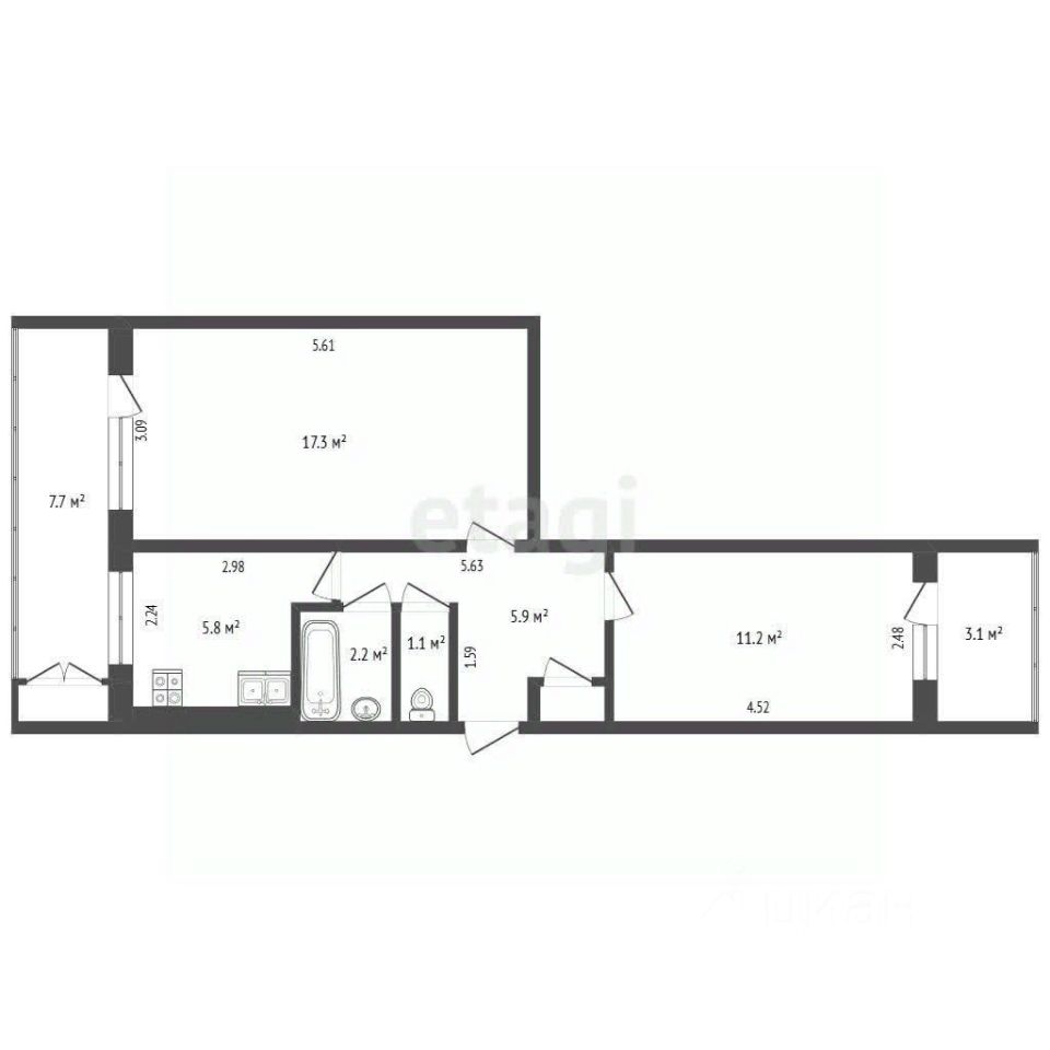 Общая площадь квартиры 49.4 кв.м, две изолированные комнаты 17,3 и 11.2 кв.м., кухня, две лоджии, санузел раздельный.