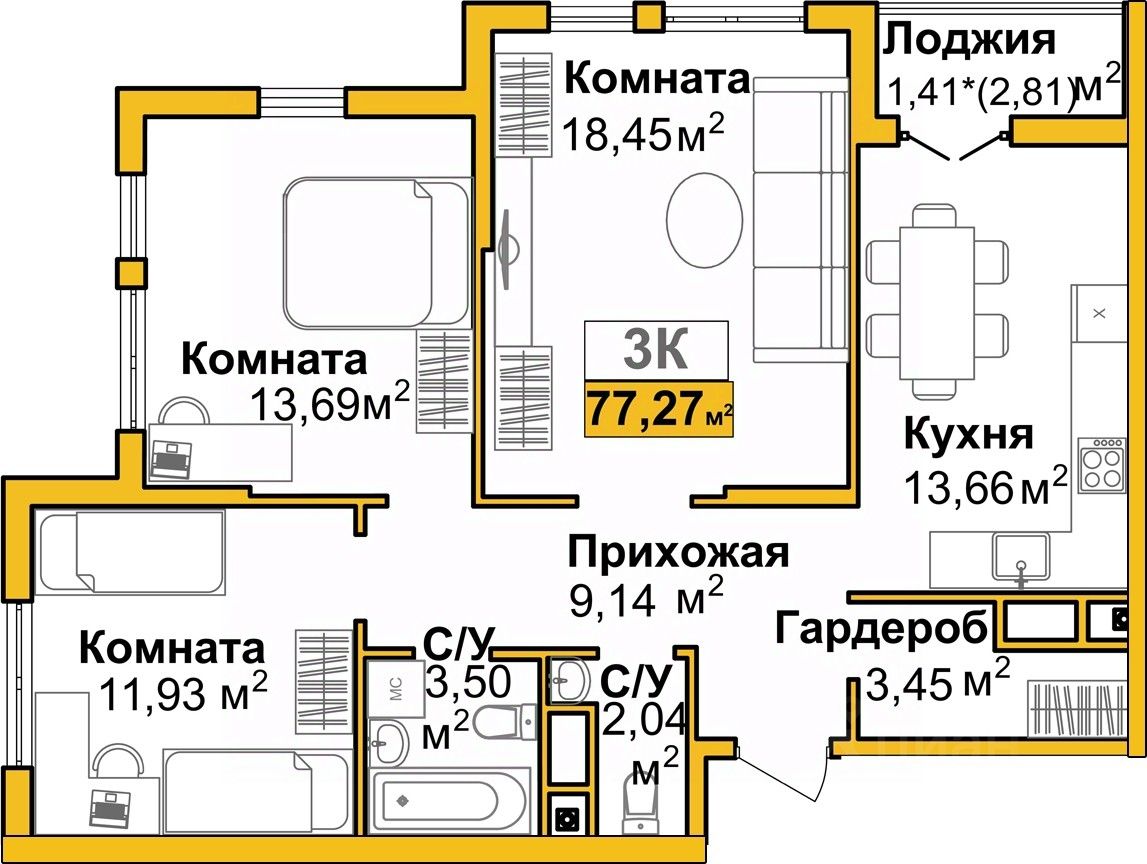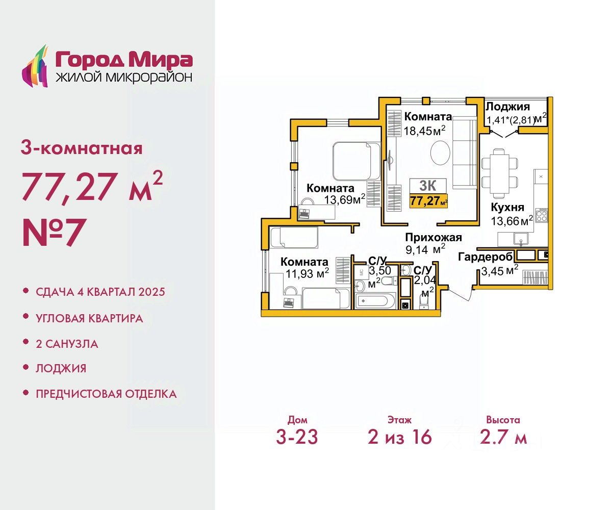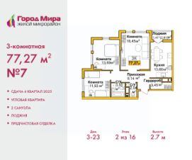 3-комн. квартира от застройщика с предчистовой отделкой в ЖМ "Город Мира" на 2 этаже. Общая площадь: 77.27 кв.м., жилая: 44.07 кв.м., площадь просторной кухни-столовой: 13.66 кв.м. Угловая квартира, очень светлая, естественная вентиляция при открытии окон. В квартире одна лоджия, один совмещенный и один раздельный санузел. Высота потолков 2.7 м.