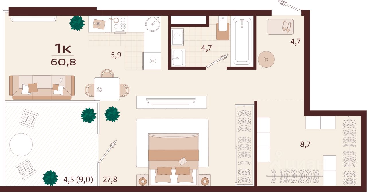 Продаётся 1-комнатная квартира в строящемся доме (Корпус 1), срок сдачи: II-кв. 2027, общей площадью 60.8 кв.м., на 4 этаже. Жилой комплекс бизнес-класса "РОЯЛТА" от застройщика "ГК ТОЧНО" в городе Ялта Республики Крым на улице Спендиарова.