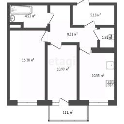 Светлые и просторные спальни 16 м2 и 11 м2, кухня 10,5 м2.
