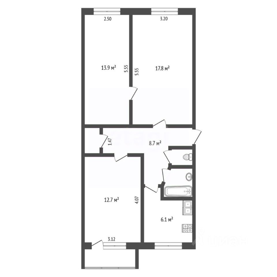 Три комнаты : просторный зал и две спальни, раздельный санузел, кладовая.
