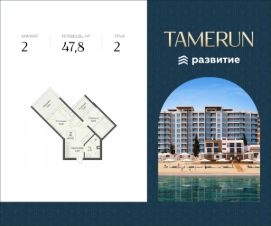 В продаже 2 комнатный апартамент площадью 47.80 кв. м, без отделки. Апартамент расположен в апарт-комплексе Tamerun от ГК "Развитие".