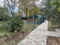 Придомовая территория ухоженная, двор асфальтирован, есть новая детская площадка.