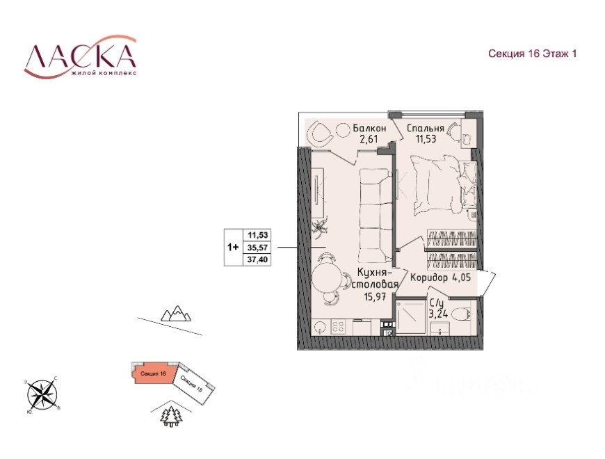 Эта однокомнатная квартира бизнес-класса в ЖК Ласка — воплощение комфорта и элегантности в самом сердце Алушты. Площадь 35,57 м² на первом этаже — идеальное сочетание уюта и функциональности для ценителей качественной жизни.
