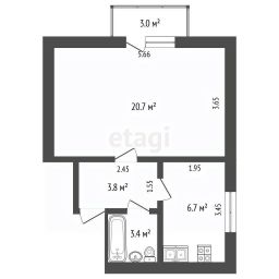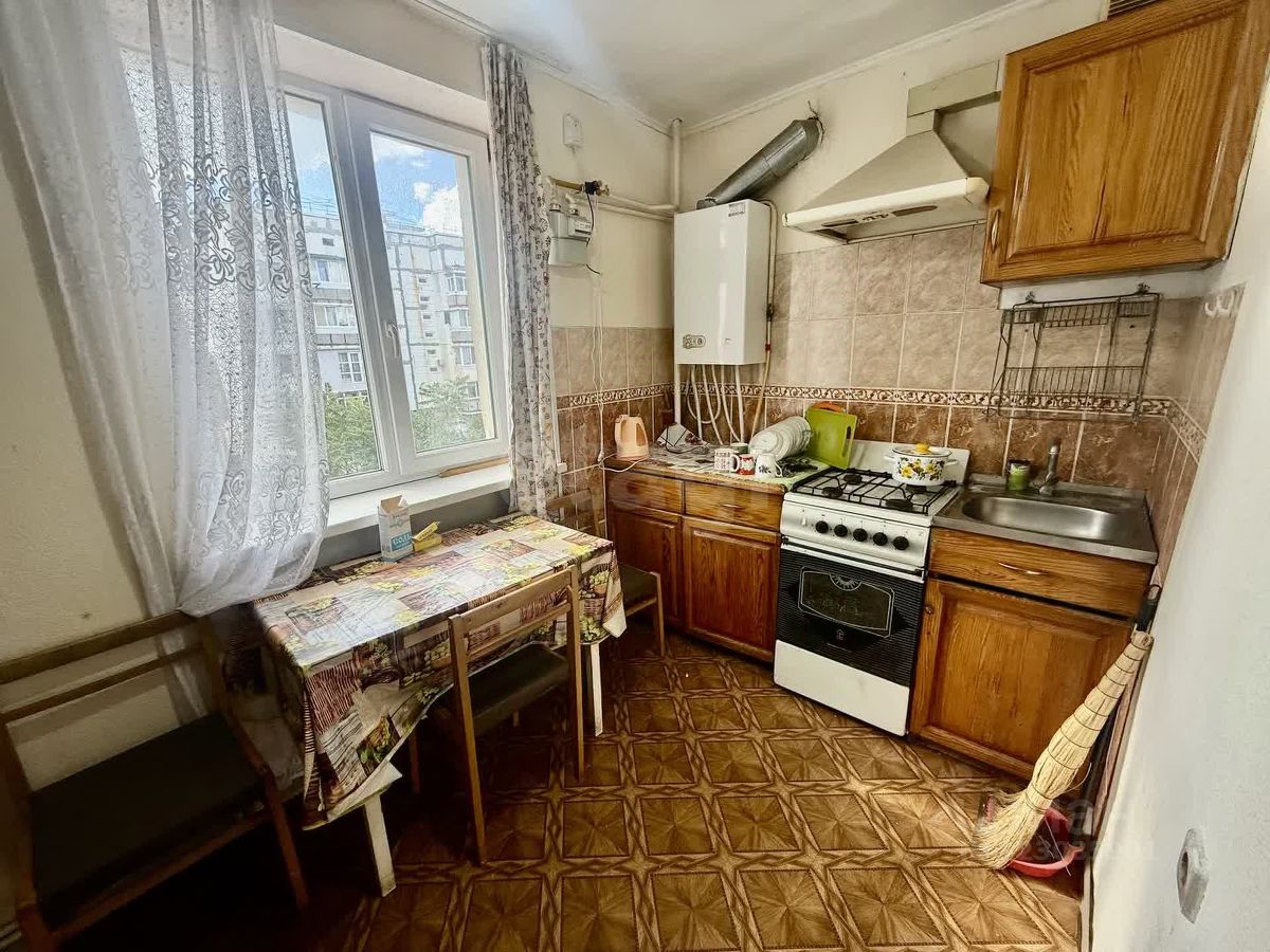 Однокомнатная квартира площадью 34,6 кв. м расположена на третьем этаже пятиэтажного дома в курортной части поселка Новофедоровка. Планировка включает изолированную жилую комнату с выходом на лоджию и кухню 6,7 кв. м.