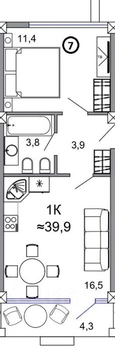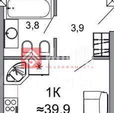 - Общая площадь: 35,4 кв.м., спальня + кухня-гостиная