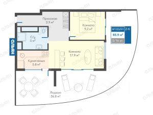 Кухня-ниша 5,8 м2, санузел 5 м2, прихожая 3,9 м2, комната 9,2 м2, комната 17,9 м2, лоджия 44,6 м2.