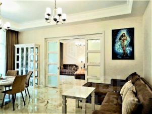 Квартира выполнена в изысканном дизайне с применением высококачественных отделочных материалов, оснащена современной мебелью и бытовой техникой.