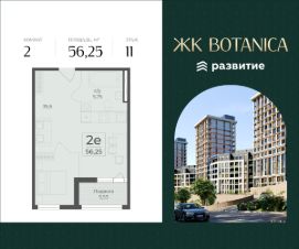 Продается квартира площадью 56.25 кв. м с отделкой white box на 11 этаже 15 этажного дома. Квартира находится в 2 секции жилого комплекса бизнес-класса Botanica.