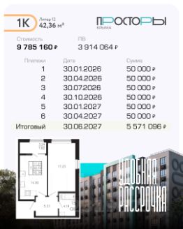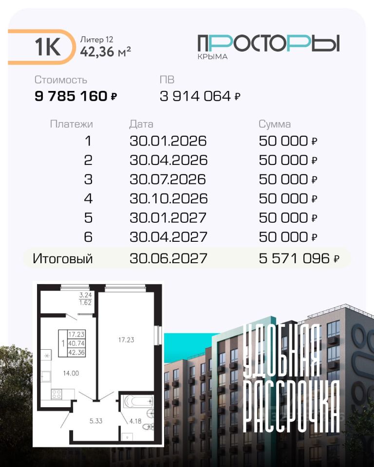 Основные характеристики: Общая площадь: 42,36 м² Кухня: 14 м² Санузел: 4,18 м² Балкон 3,24 м² Прихожая 5,33 м² Планировка: свободная Высота потолков: уточняется по запросу Вид : на парк Преимущества покупки: Исключительное расположение в непосредственной близости от Черноморского побережья (около 800 метров). Новый жилой комплекс с собственной развитой инфраструктурой (детские сады, школы, поликлиника, спортивный клуб, развлекательная зона). Доступность экологически чистого морского воздуха и круглогодичного отдыха на берегу моря. Предчистовая отделка (white-box), что позволит обустроить пространство по своему вкусу. Широкий спектр вариантов оплаты: наличный расчет, ипотека (включая семейную ипотеку и оплату частями). Отсутствие дополнительных комиссий и скрытых расходов. Особенности инфраструктуры: Образование: дошкольные учреждения, школы различного уровня образования. Медицинское обслуживание: современная поликлиника и аптечные пункты. Природа и отдых: зеленый парк площадью 6,69 гектаров, оборудованные пешеходные маршруты, живописные озёра и лесополосы. Физическое развитие: беговые дорожки, велодорожки, современные игровые и спортивные площадки. Дети и животные: специализированные площадки для прогулок с детьми и домашними животными. Парковочное пространство: предусмотрены подземные и наземные парковки. Дополнительные возможности: Доступность двух морских побережий: Чёрное море всего в 10 минутах езды на автомобиле, Азовское море в 20 минутах поездки. Чистота экологии: ухоженные зеленые зоны, чистая вода и свежий воздух способствуют здоровому образу жизни. Целый мир удобств и возможностей буквально в одном месте жительства. Информация о приобретении: Оплата возможна наличными средствами либо ипотекой различной формы (стандартная, семейная, траншевая). Узнавайте подробности и акции . Цена П.В. - 3.914.064 руб. Стоимость : 9.785.160 руб. Ваш идеальный вариант комфортного проживания теперь доступен по выгодной цене и удобным условиям оплаты. Сделайте свою жизнь идеальной, купив эту прекрасную однокомнатную квартиру в Крыму!