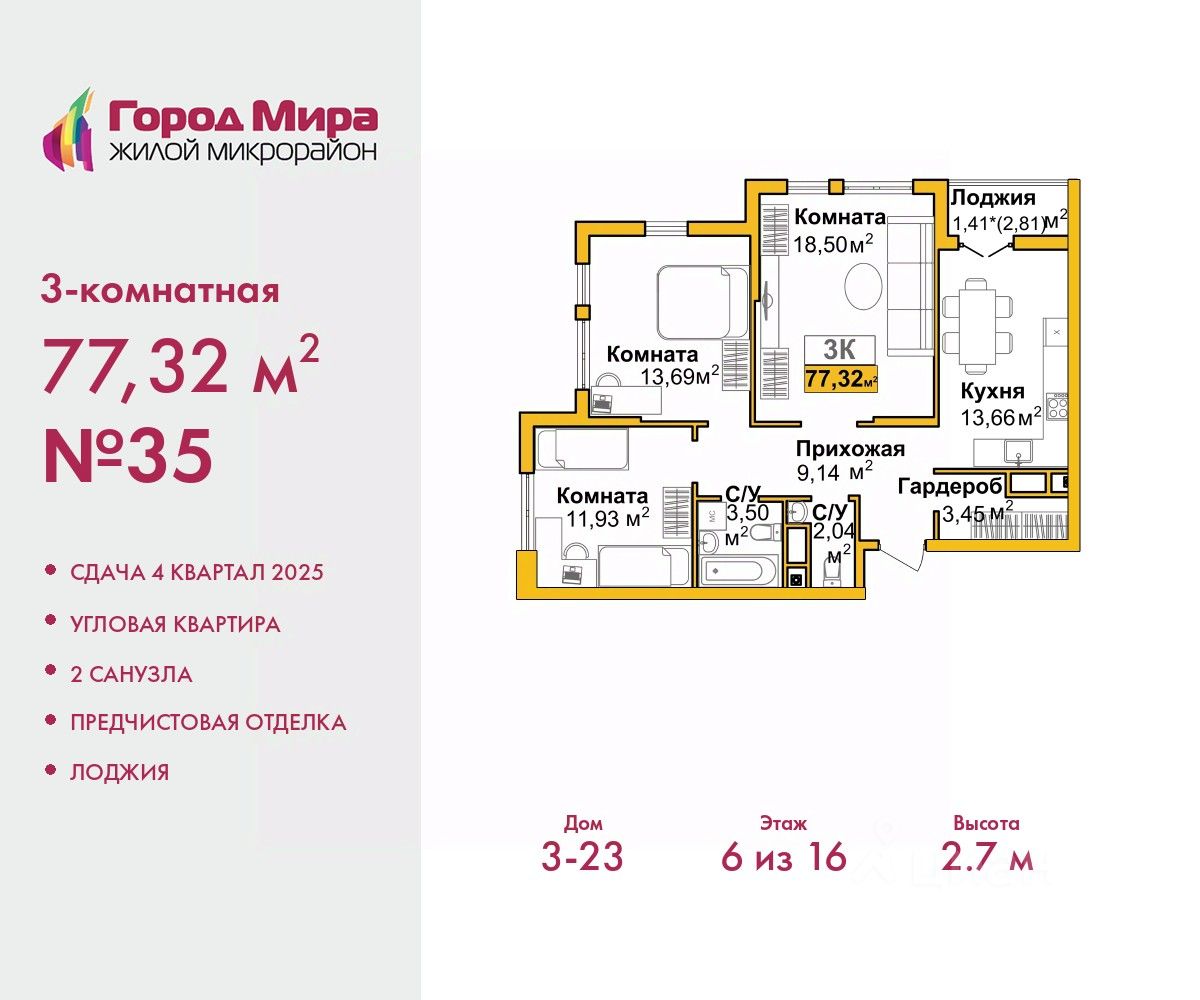 Просторная трехкомнатная квартира с предчистовой отделкой в ЖМ "Город Мира" на 6 этаже. Общая площадь: 77.32 кв.м., жилая: 44.12 кв.м., площадь просторной кухни-столовой: 13.66 кв.м. Угловая квартира, очень светлая, естественная вентиляция при открытии окон. В квартире одна лоджия, один совмещенный и один раздельный санузел. Высота потолков 2.7 м.