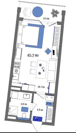Продаются 1-комнатные апартаменты в сданном доме (корпус А), срок сдачи: III-кв. 2024, общей площадью 45.2 кв.м., на 6 этаже.