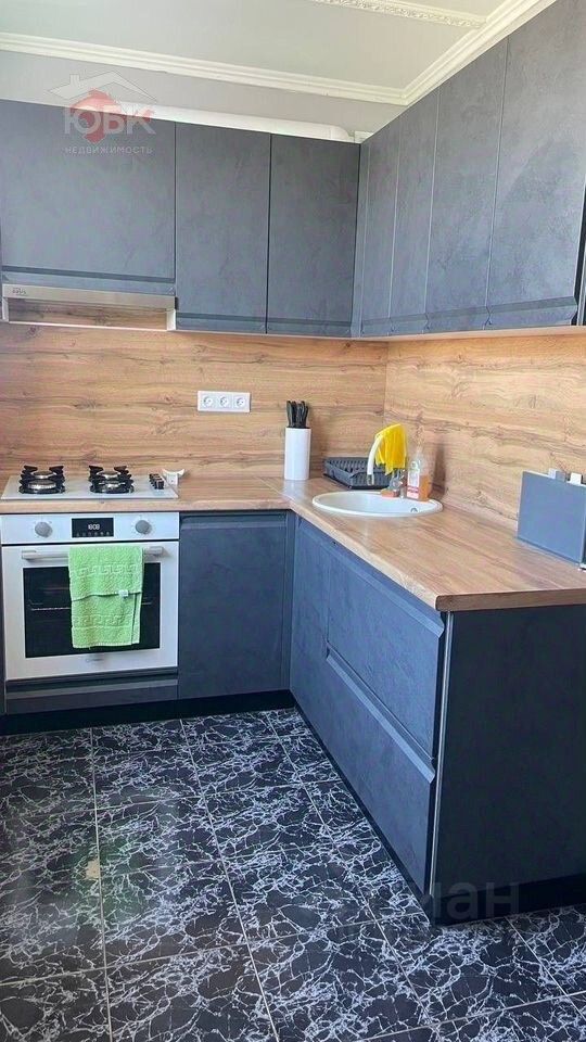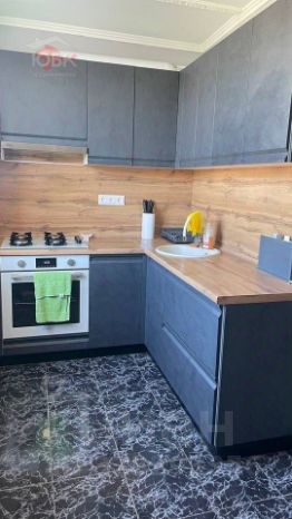 Кухня - просторная и светлая. Кухня сделана под заказ. Плита (газовая) духовой шкаф (электрический) вытяжка, краны - все новое. На полу лежит плитка.