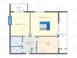Кухня 8,3 м2, санузел 4,4 м2, комната 11,4 м2, комната 16,5 м2, лоджия 9 м2, балкон 3 м2 прохожая 5,1 м2.