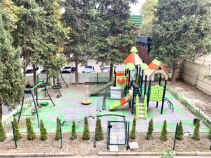 Красивый зеленый благоустроенный двор, новые детские и спортивные площадки, парковка во дворе.