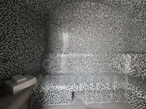 -1 этаж: прихожая (9.6 кв.м.), коридор (12.5 кв.м.), кухня-столовая (30.5 кв.м.), тренажерный зал (26.6 кв.м.), бассейн + хаммам (73.8 кв.м.), сан узел (4.3 кв.м.), гараж (19.4 кв.м.).