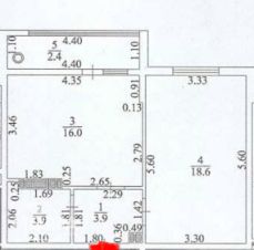 1-комнатная квартира общей площадью 42,4кв.м., жилая 18,6кв.м., кухня 16кв.м.