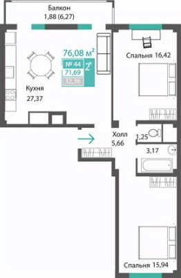 Продаётся 2-комнатная квартира в строящемся доме (ЭТАП 1, СЕКЦИИ А1, А2, А3), срок сдачи: III-кв. 2028, общей площадью 71.69 кв.м., на 2 этаже. Новый жилой комплекс "Семейный квартал ПРОПОЛИС" от застройщика "Монолит" расположен по адресу: Республика Крым, Симферопольский район, с. Мирное, ул. Учительская