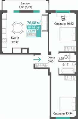 Продаётся 2-комнатная квартира в строящемся доме (ЭТАП 1, СЕКЦИИ А1, А2, А3), срок сдачи: III-кв. 2028, общей площадью 71.69 кв.м., на 8 этаже. Новый жилой комплекс "Семейный квартал ПРОПОЛИС" от застройщика "Монолит" расположен по адресу: Республика Крым, Симферопольский район, с. Мирное, ул. Учительская