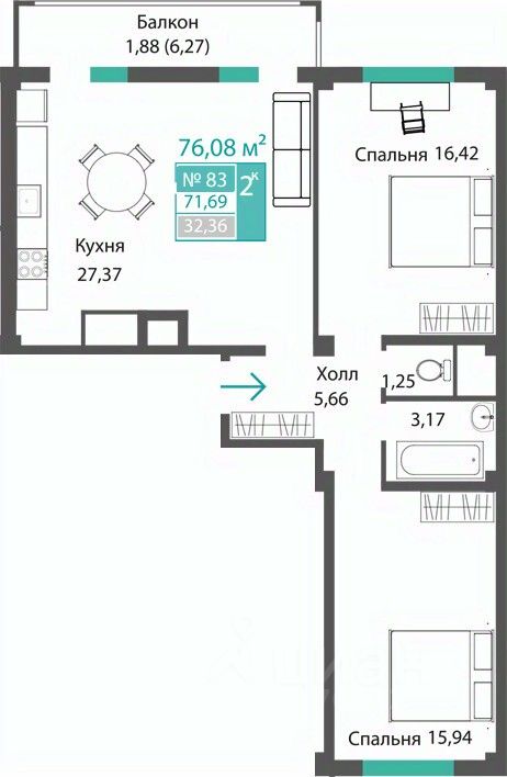 Продаётся 2-комнатная квартира в строящемся доме (ЭТАП 1, СЕКЦИИ А1, А2, А3), срок сдачи: III-кв. 2028, общей площадью 71.69 кв.м., на 2 этаже. Новый жилой комплекс "Семейный квартал ПРОПОЛИС" от застройщика "Монолит" расположен по адресу: Республика Крым, Симферопольский район, с. Мирное, ул. Учительская