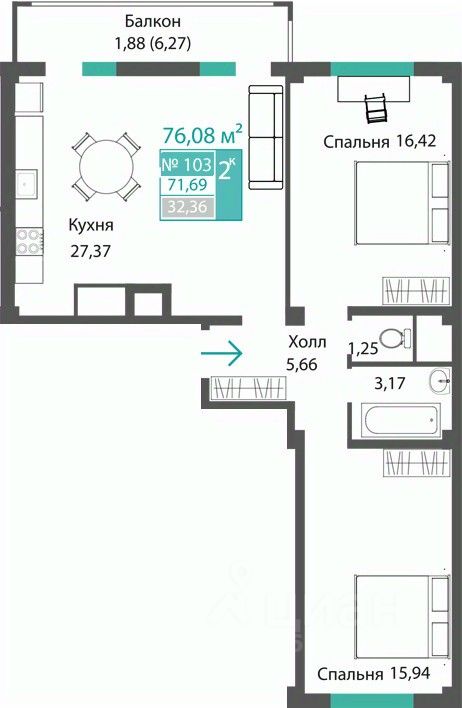 Продаётся 2-комнатная квартира в строящемся доме (ЭТАП 1, СЕКЦИИ А1, А2, А3), срок сдачи: III-кв. 2028, общей площадью 71.69 кв.м., на 6 этаже. Новый жилой комплекс "Семейный квартал ПРОПОЛИС" от застройщика "Монолит" расположен по адресу: Республика Крым, Симферопольский район, с. Мирное, ул. Учительская