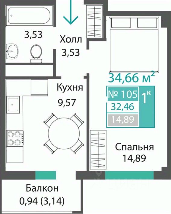 Продаётся 1-комнатная квартира в строящемся доме (ЭТАП 1, СЕКЦИИ А1, А2, А3), срок сдачи: III-кв. 2028, общей площадью 32.46 кв.м., на 6 этаже. Новый жилой комплекс "Семейный квартал ПРОПОЛИС" от застройщика "Монолит" расположен по адресу: Республика Крым, Симферопольский район, с. Мирное, ул. Учительская