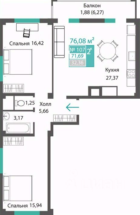 Продаётся 2-комнатная квартира в строящемся доме (ЭТАП 1, СЕКЦИИ А1, А2, А3), срок сдачи: III-кв. 2028, общей площадью 71.69 кв.м., на 6 этаже. Новый жилой комплекс "Семейный квартал ПРОПОЛИС" от застройщика "Монолит" расположен по адресу: Республика Крым, Симферопольский район, с. Мирное, ул. Учительская