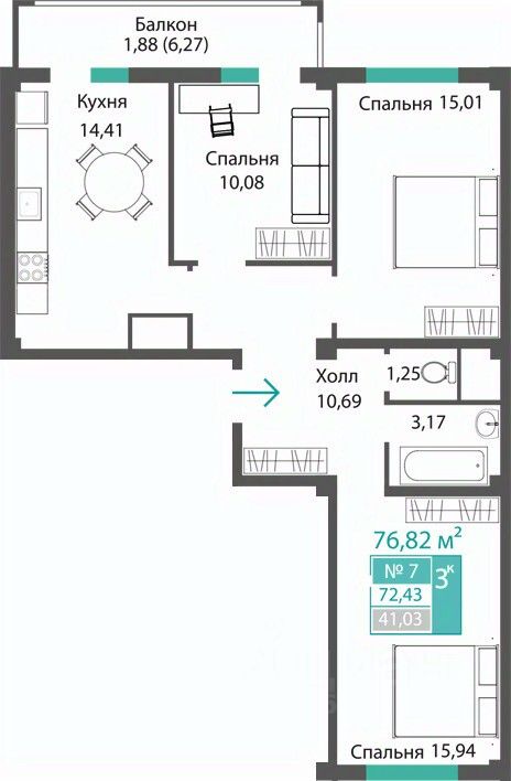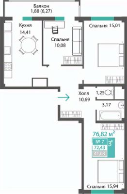 Продаётся 3-комнатная квартира в строящемся доме (ЭТАП 2, СЕКЦИИ Б1, Б2, Б3, Б4), срок сдачи: III-кв. 2028, общей площадью 72.43 кв.м., на 3 этаже. Новый жилой комплекс "Семейный квартал ПРОПОЛИС" от застройщика "Монолит" расположен по адресу: Республика Крым, Симферопольский район, с. Мирное, ул. Учительская