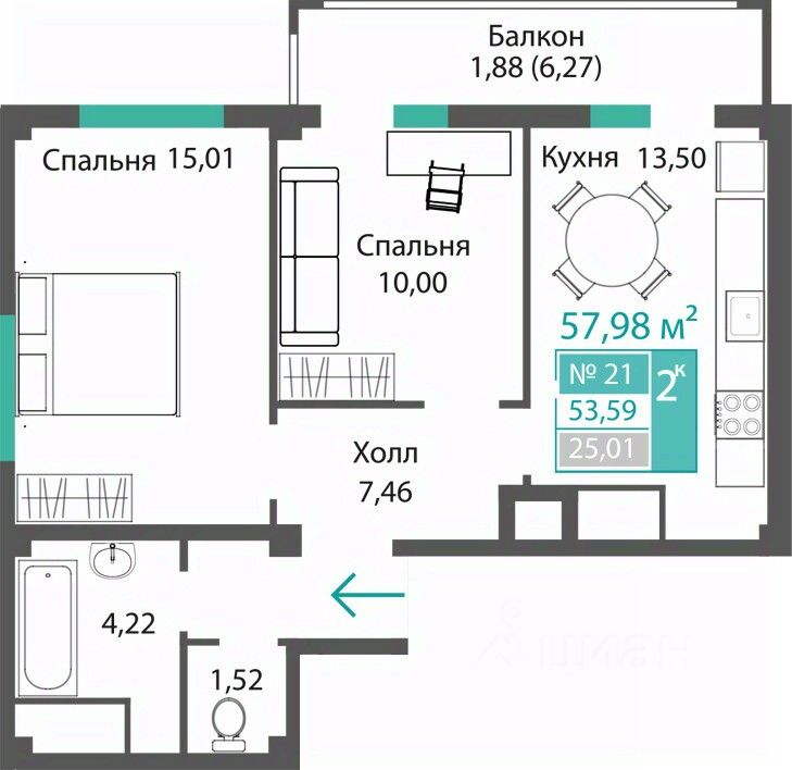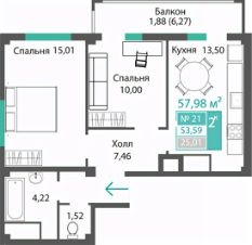 Продаётся 2-комнатная квартира в строящемся доме (ЭТАП 2, СЕКЦИИ Б1, Б2, Б3, Б4), срок сдачи: III-кв. 2028, общей площадью 53.59 кв.м., на 5 этаже. Новый жилой комплекс "Семейный квартал ПРОПОЛИС" от застройщика "Монолит" расположен по адресу: Республика Крым, Симферопольский район, с. Мирное, ул. Учительская