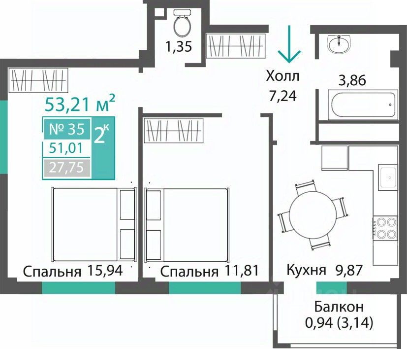 Продаётся 2-комнатная квартира в строящемся доме (ЭТАП 2, СЕКЦИИ Б1, Б2, Б3, Б4), срок сдачи: III-кв. 2028, общей площадью 51.01 кв.м., на 8 этаже. Новый жилой комплекс "Семейный квартал ПРОПОЛИС" от застройщика "Монолит" расположен по адресу: Республика Крым, Симферопольский район, с. Мирное, ул. Учительская