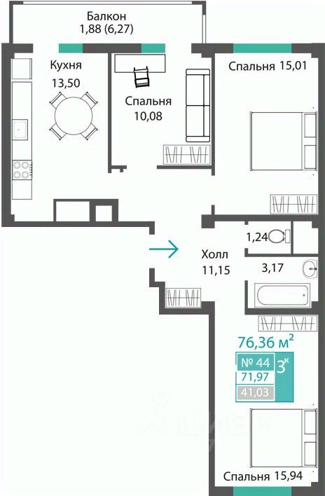 Продаётся 3-комнатная квартира в строящемся доме (ЭТАП 2, СЕКЦИИ Б1, Б2, Б3, Б4), срок сдачи: III-кв. 2028, общей площадью 71.97 кв.м., на 3 этаже. Новый жилой комплекс "Семейный квартал ПРОПОЛИС" от застройщика "Монолит" расположен по адресу: Республика Крым, Симферопольский район, с. Мирное, ул. Учительская