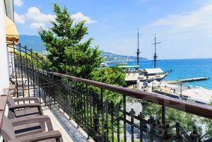 Трехкомнатные апартаменты премиум-класса площадью 105 м², распланированы следующим образом: огромная гостиная со столовой зоной, две спальни, ванная комната с джакузи, балкон и великолепная терраса с видом на море и набережную Ялты.