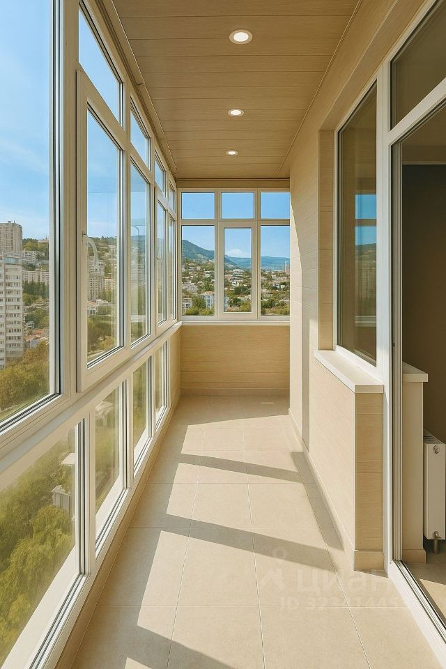 В квартире установлены межкомнатные перегородки, выполнена стяжка полов и штукатурка стен, заведены все коммуникации, установлены радиаторы и счетчики. Лоджия по периметру квартиры. Из всех окон открывается панорамный вид на горы, море. Есть возможность сделать планировку по своему желанию.